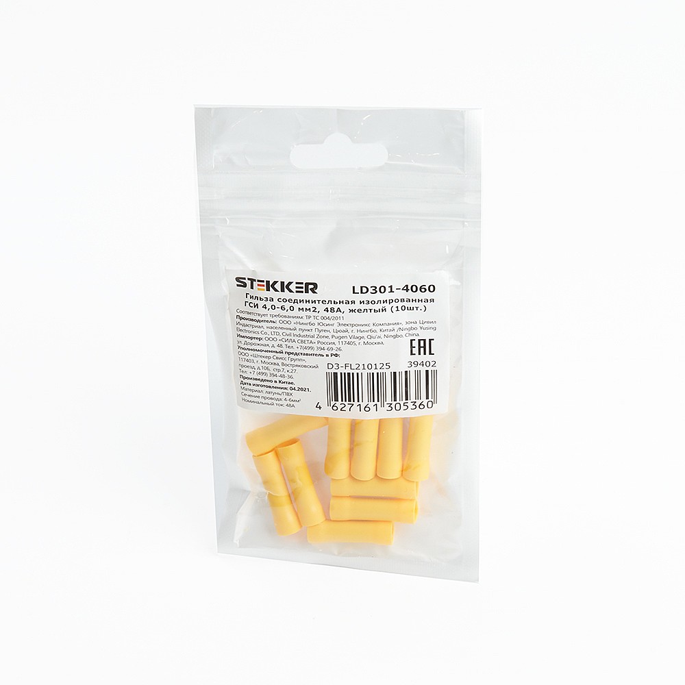 Гильза соединительная изолированная сечение 4,0-6,0 мм2, 48A, желтый (DIY упаковка 10 шт) Stekker LD301-4060 39402