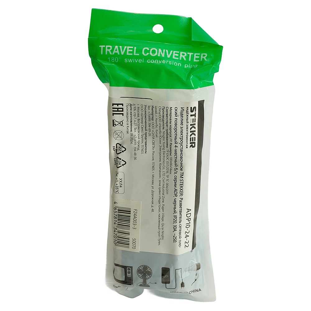Сетевой разветвитель STEKKER ADP10-24-22 без заземления, количество присоединяемых устройств 4, номинальное напряжение 250В, номинальный ток 10А, материал PP, цвет черный, IP20