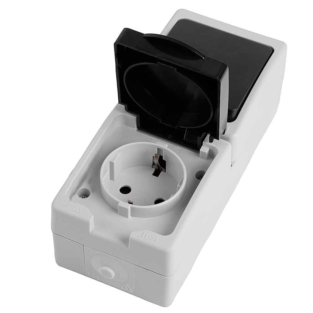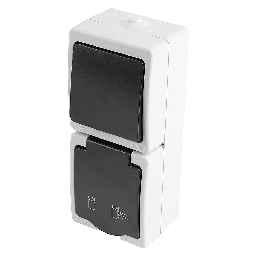 Розетка STEKKER PST16-11-54V/10-111-54 (блок с выключателем одноклавишным однополюсным,для двух цепей с общим вводом ,раст-ие между монтажн. отверстиями: по гориз. - 113мм, по вертик.- 65мм, с защитными шторками.) на 1 гнездо, с крышкой, с заземлением. Материал: Полипропилен, ABS пластик, латунь, цвет серый-графит, размер 130*80*55мм. Номинальное напряжение 250, номинальный ток 16А, диапазон рабочих температур 0..+35?C, IP54