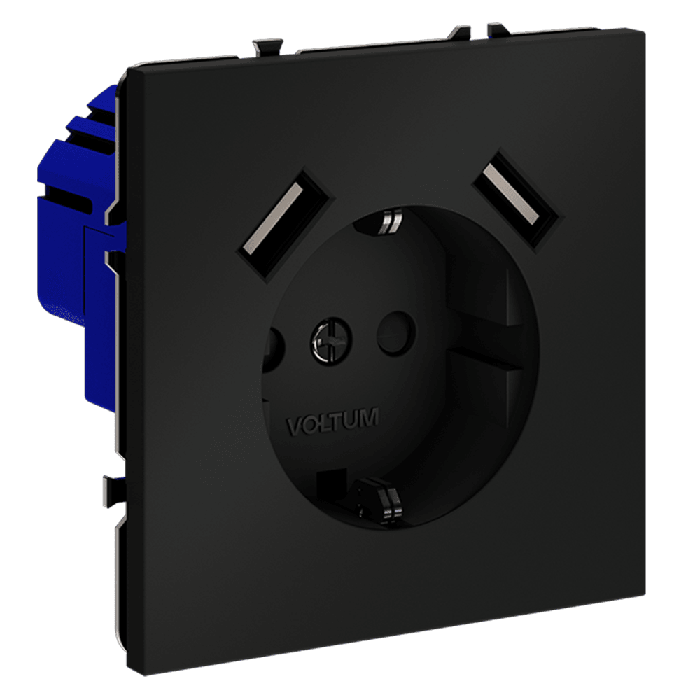 Розетка встраиваемая VOLTUM S70 с заземлением и защитными шторками, 16А, с USB, A+A, (черный матовый VLS040408