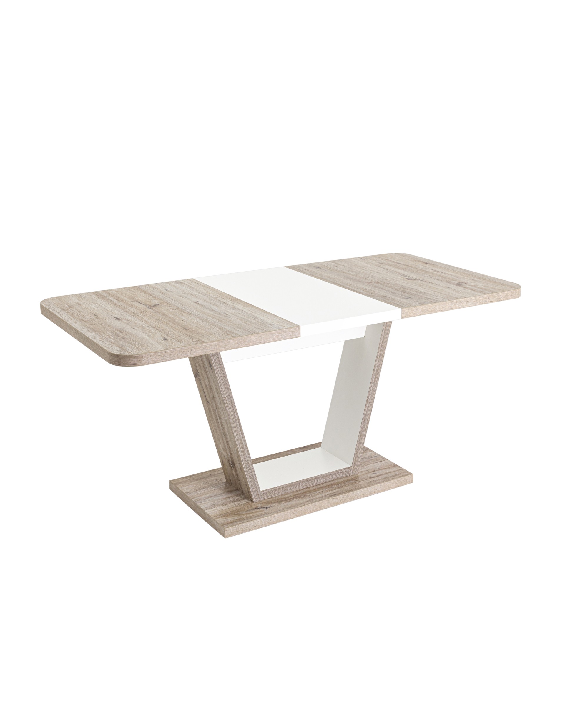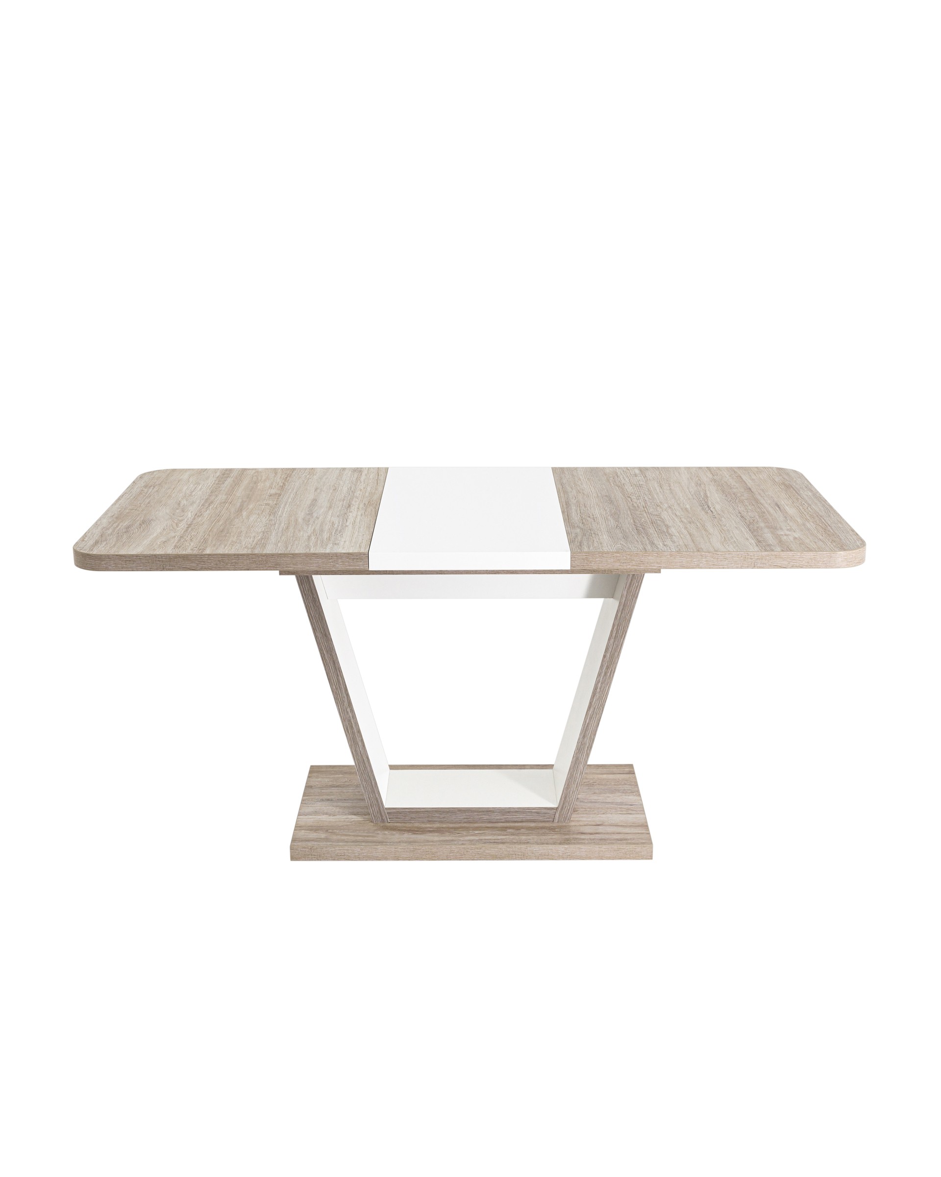 Стол оснащен синхронно-раздвижным механизмом. Разложить столешницу не составит труда даже подростку. Для того, чтобы разложить стол, достаточной потянуть за одну из половинок столешницы, вторая половинка при этом раздвинется автоматически, далее следует извлечь цельную вставку из основания стола, аккуратно уложить ее на основание, сдвинуть половинки и закрепить специальным зажимом.