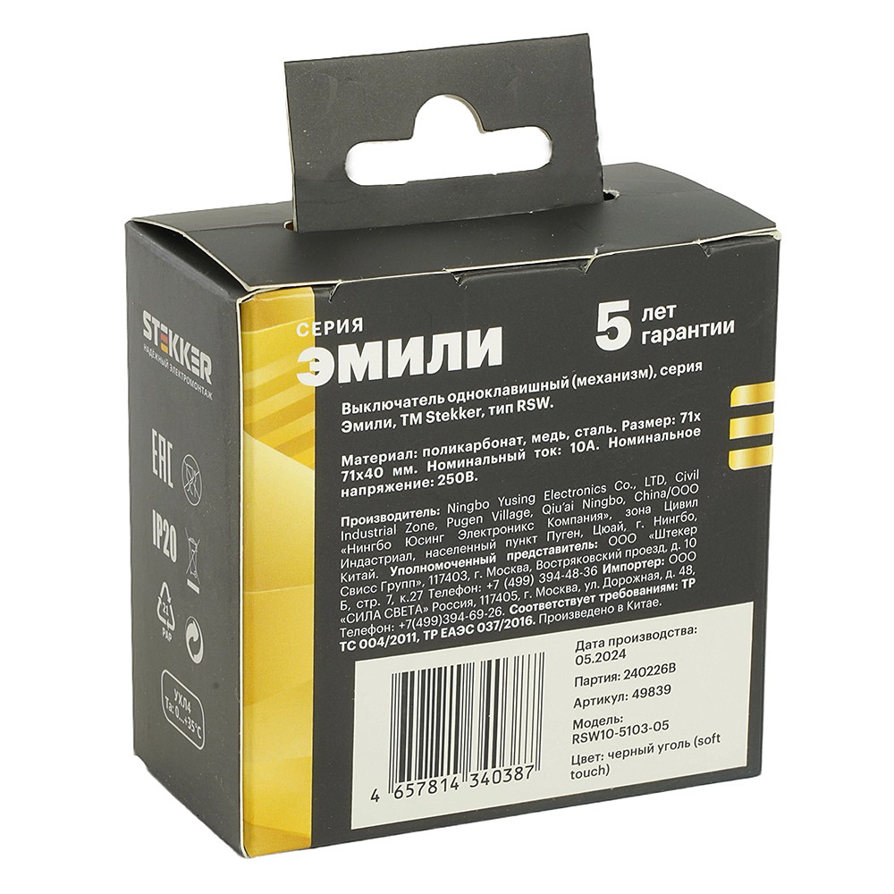Выключатели одноклавишный STEKKER RSW10-5103-05, серия Эмили тип установки - скрытый, размер изделия 70*70*35мм., цвет черный уголь, soft touch, материал изделия поликарбонат, бронза, сталь. Номинальное напряжение 250 , номинальный ток 10А, 20