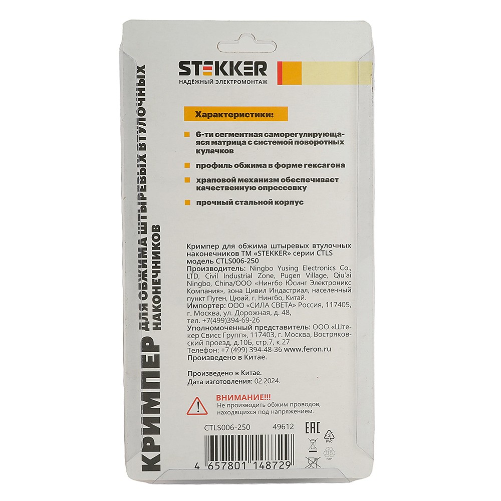Кримпер для обжима штыревых втулочных наконечников 0,25-6мм2, 6 сегментов Stekker CTLS006-250 49612