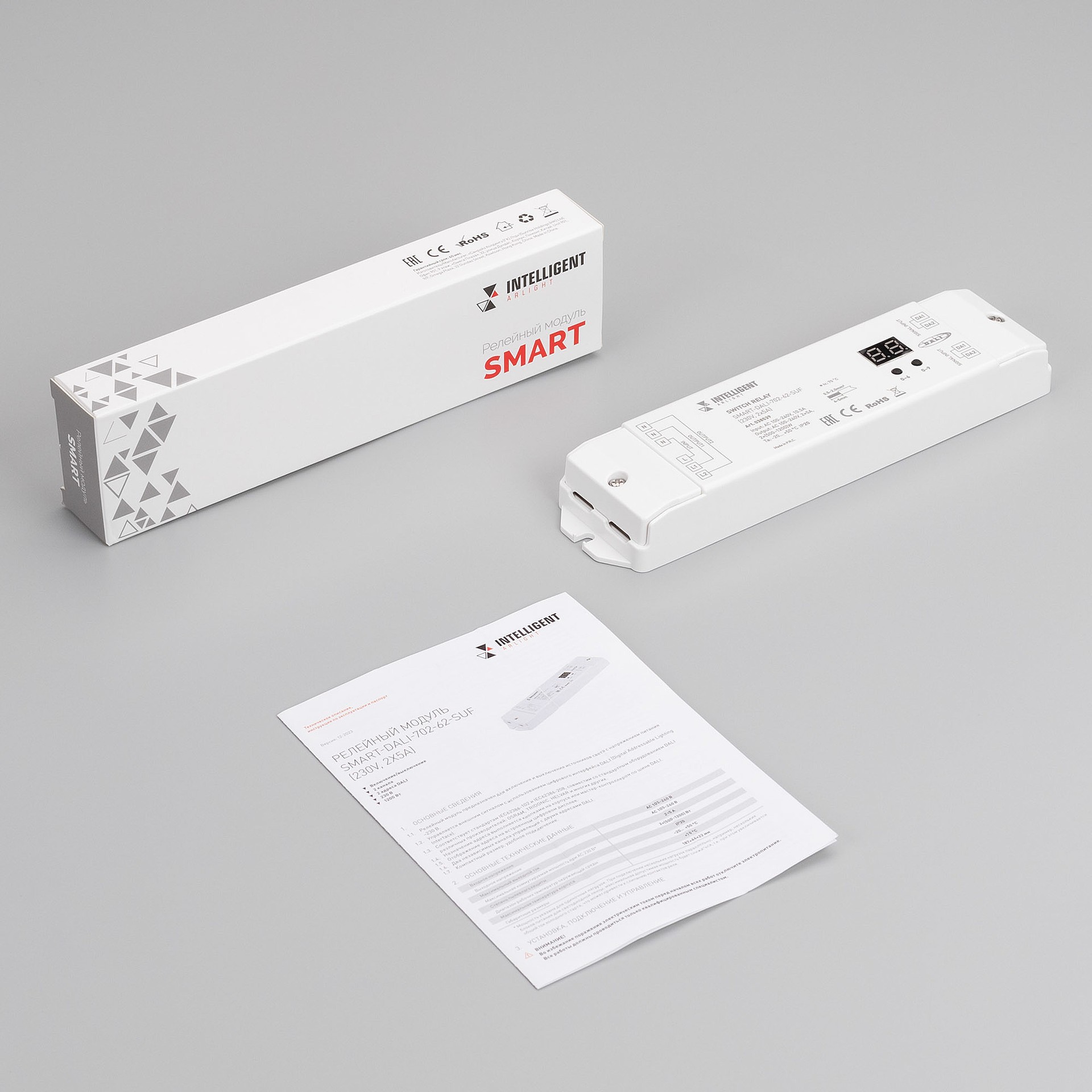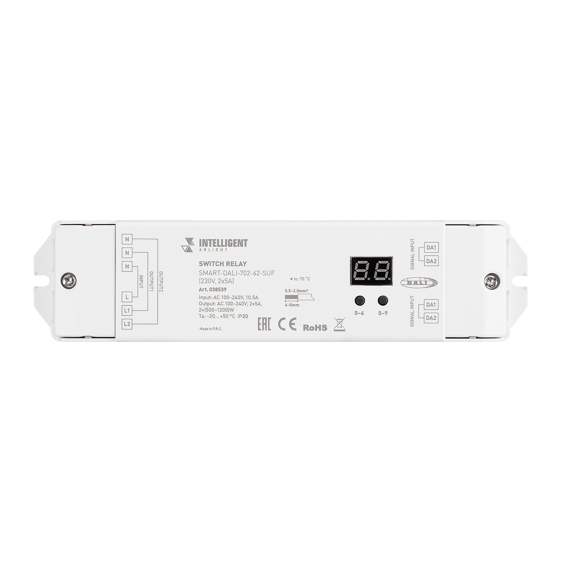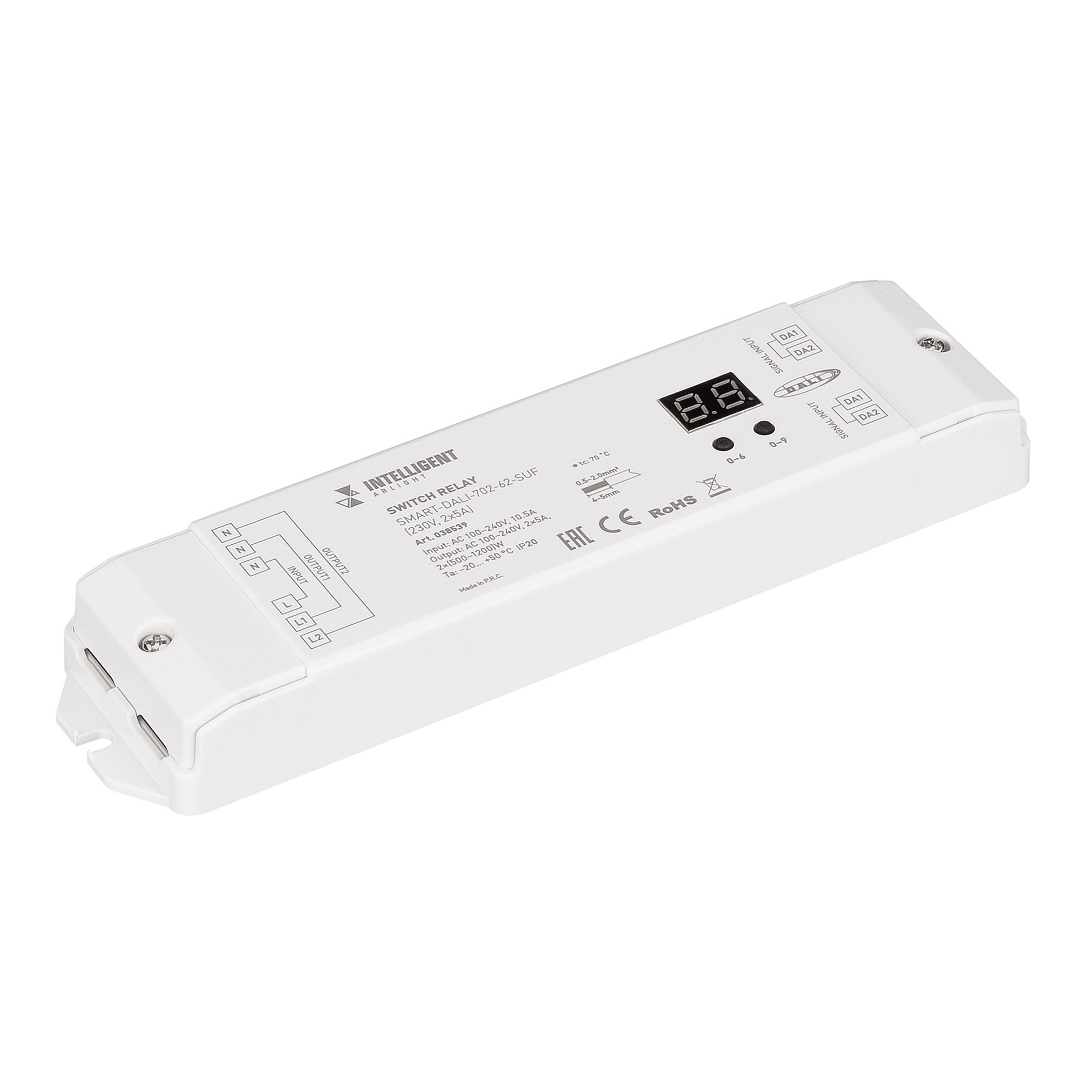 Двухканальный релейный модуль, предназначенный для включения и выключения источников света напряжением питания 230В с максимальным выходным током 5А на канал. Управляется внешним сигналом с использованием цифрового интерфейса DALI. Назначение адреса выполняется кнопками на корпусе или мастер-контроллером по шине DALI. Устройство имеет два независимых канала управления с двумя адресами DALI. Для удобства конфигурирования устройства на корпусе имеется встроенный цифровой дисплей. Релейный модуль поддерживает автоматическую и ручную установку адреса.