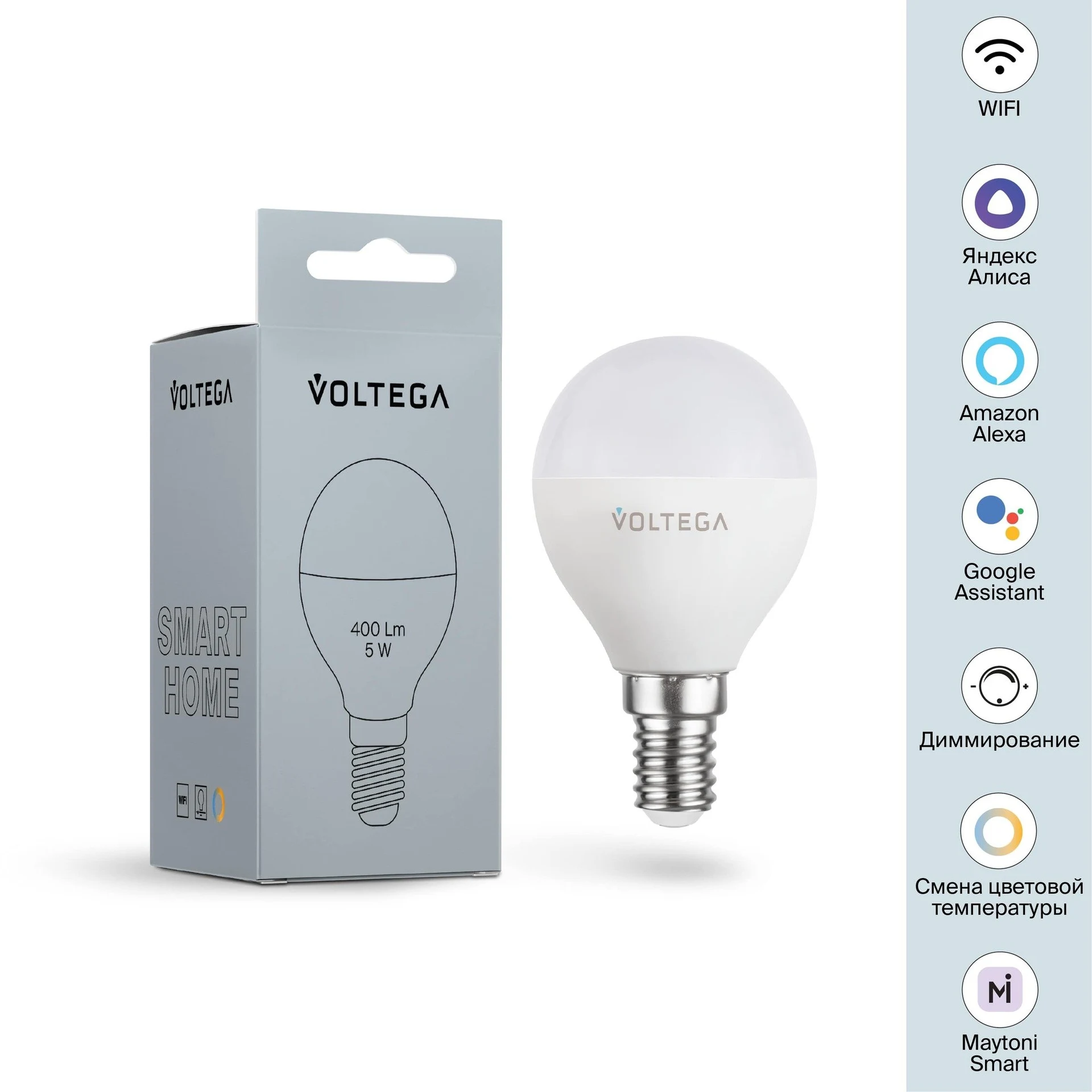 Лампочка Voltega 2428 от Voltega — лампочки. Материал — пластик, цвет белый. Модель — цоколь E14, мощность 5 Вт. Цветовая температура 2700-6500. Класс энергоэффективности G. Габариты: высота 80 мм, ширина 45 мм, диаметр 45 мм. Коллекция VG, угол рассеивания — 180, световой поток — 400.
