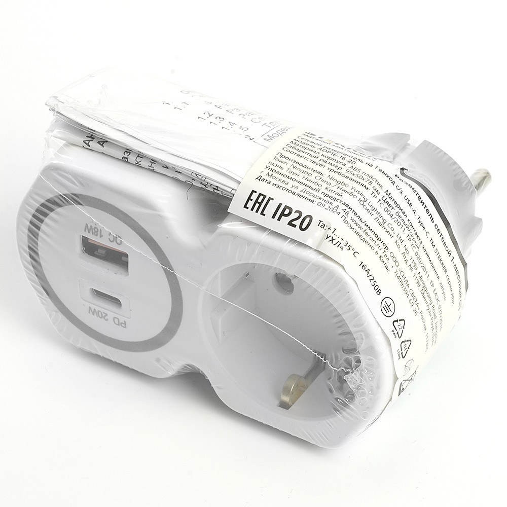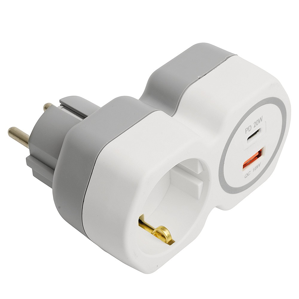 Сетевой разветвитель STEKKER ADP16-16-20 (Быстрая зарядка USB Type A QC 18W и Type C PD 20W) с заземлением, количество присоединяемых устройств USB Type A + Type C, номинальное напряжение 250В, номинальный ток 16А, материал ABS пластик, латунь, цвет белый+серый, IP20