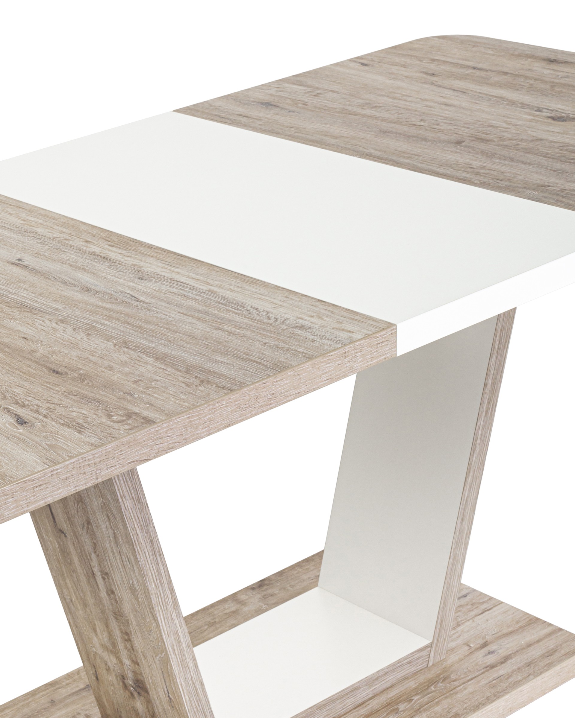 Стол оснащен синхронно-раздвижным механизмом. Разложить столешницу не составит труда даже подростку. Для того, чтобы разложить стол, достаточной потянуть за одну из половинок столешницы, вторая половинка при этом раздвинется автоматически, далее следует извлечь цельную вставку из основания стола, аккуратно уложить ее на основание, сдвинуть половинки и закрепить специальным зажимом.