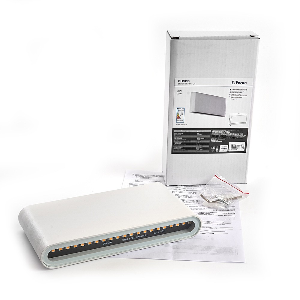 Светильник уличный светодиодный, на стену (ДБУ) FERON DH505, серия Техно, 8W, 3000К (теплый белый), 230V/50Гц, 460Lm, IP54,*SMD2835, класс защиты 1, раб.t -40градусов...+40градусов, цвет белый, корпус алюминий, 175*27*90мм,