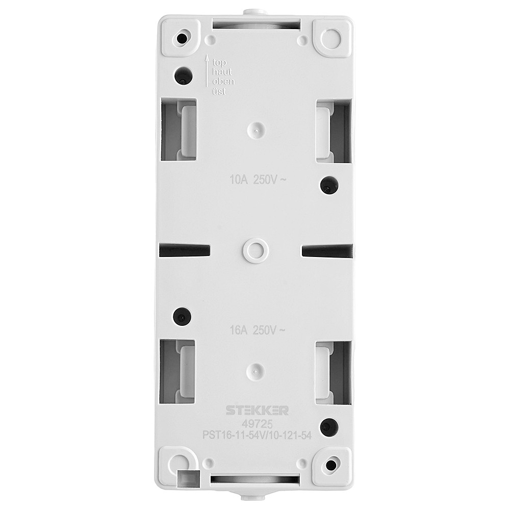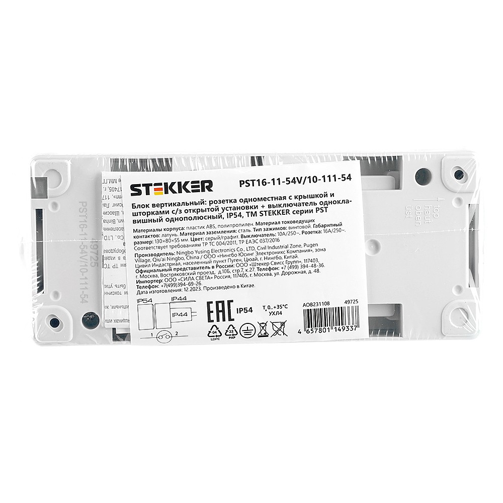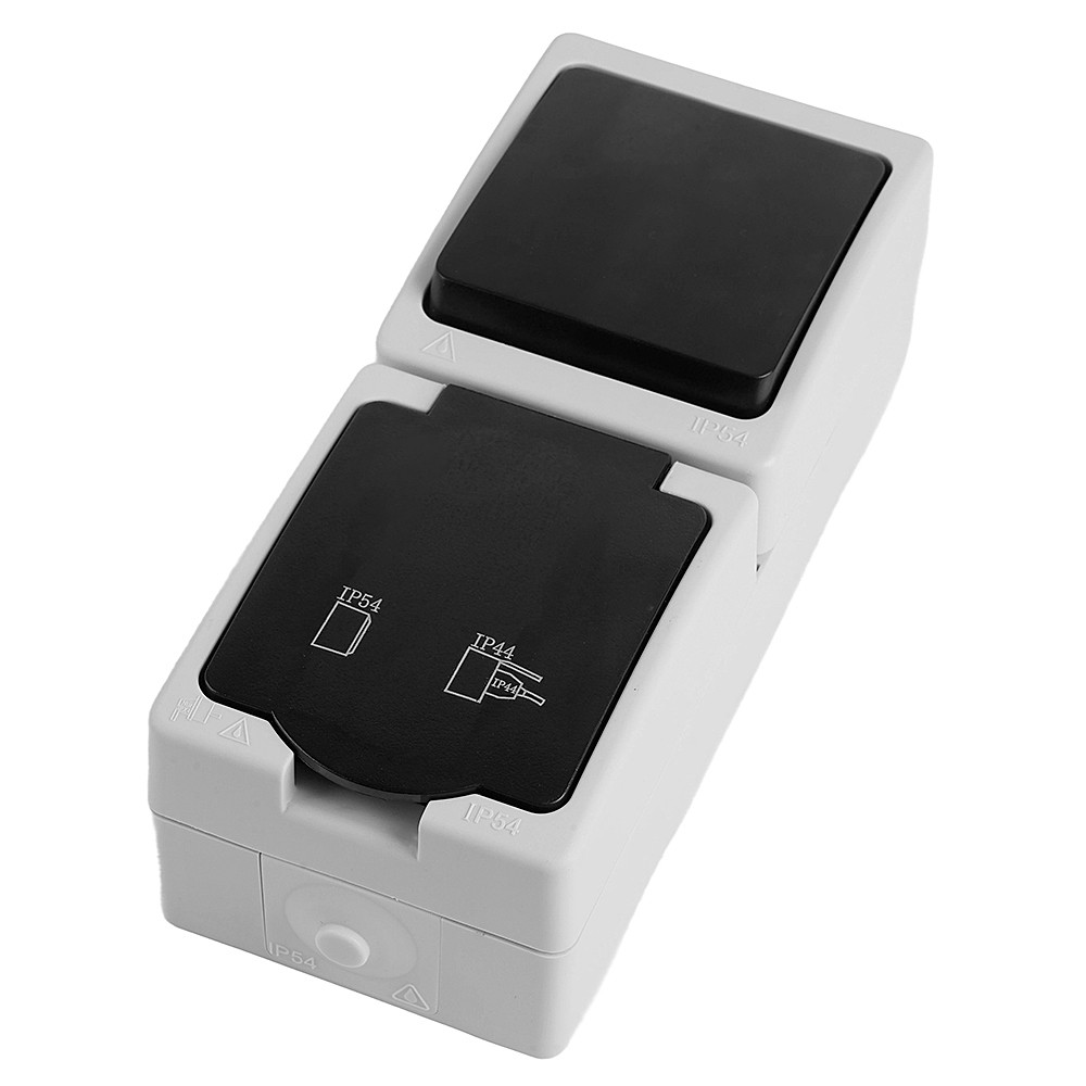 Розетка STEKKER PST16-11-54V/10-111-54 (блок с выключателем одноклавишным однополюсным,для двух цепей с общим вводом ,раст-ие между монтажн. отверстиями: по гориз. - 113мм, по вертик.- 65мм, с защитными шторками.) на 1 гнездо, с крышкой, с заземлением. Материал: Полипропилен, ABS пластик, латунь, цвет серый-графит, размер 130*80*55мм. Номинальное напряжение 250, номинальный ток 16А, диапазон рабочих температур 0..+35?C, IP54