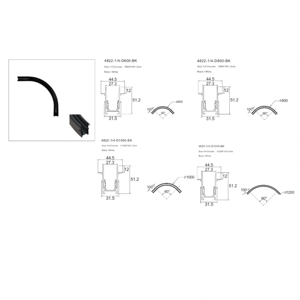 Шинопровод магнитный встраиваемый радиусный iLEDEX TECHNICAL VISION48/22 4822-1/4-D800-BK
