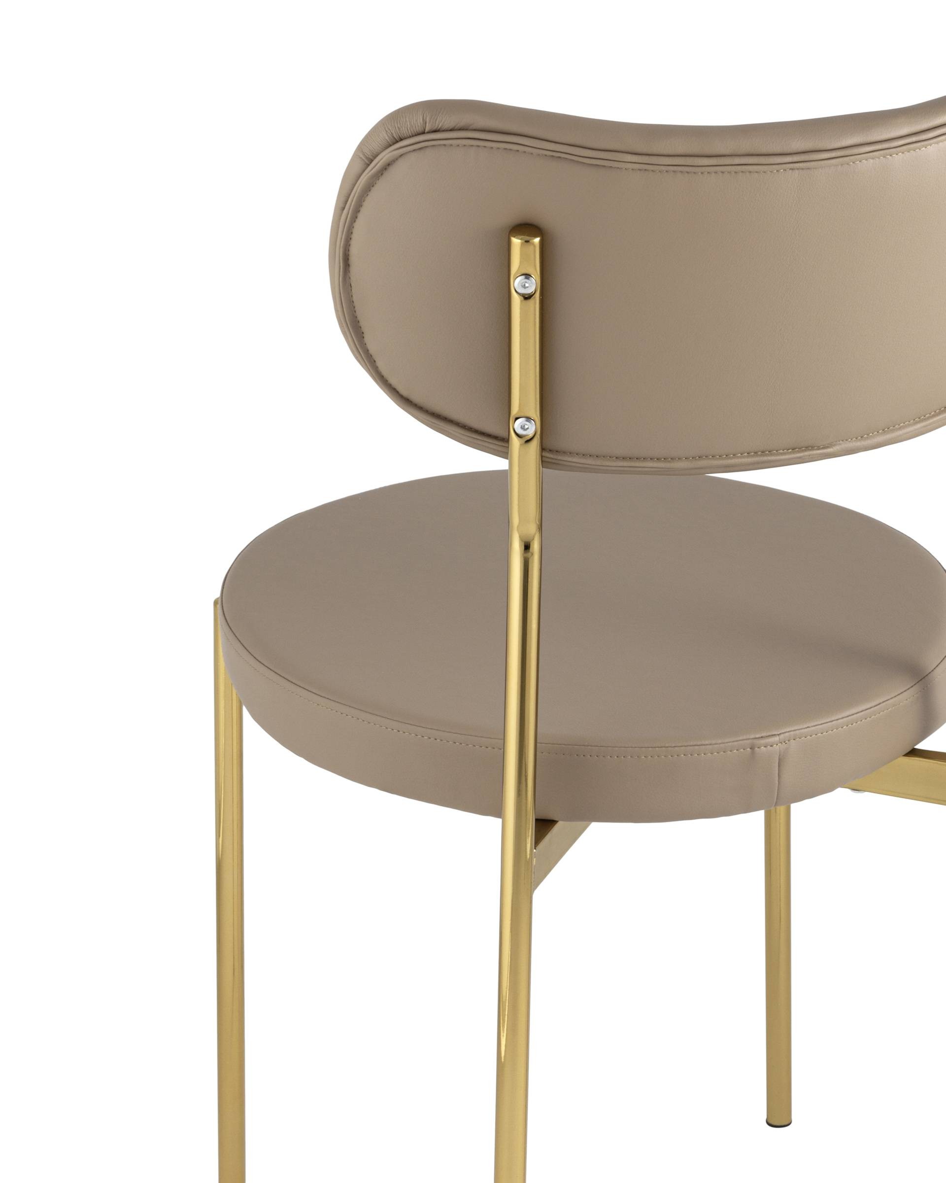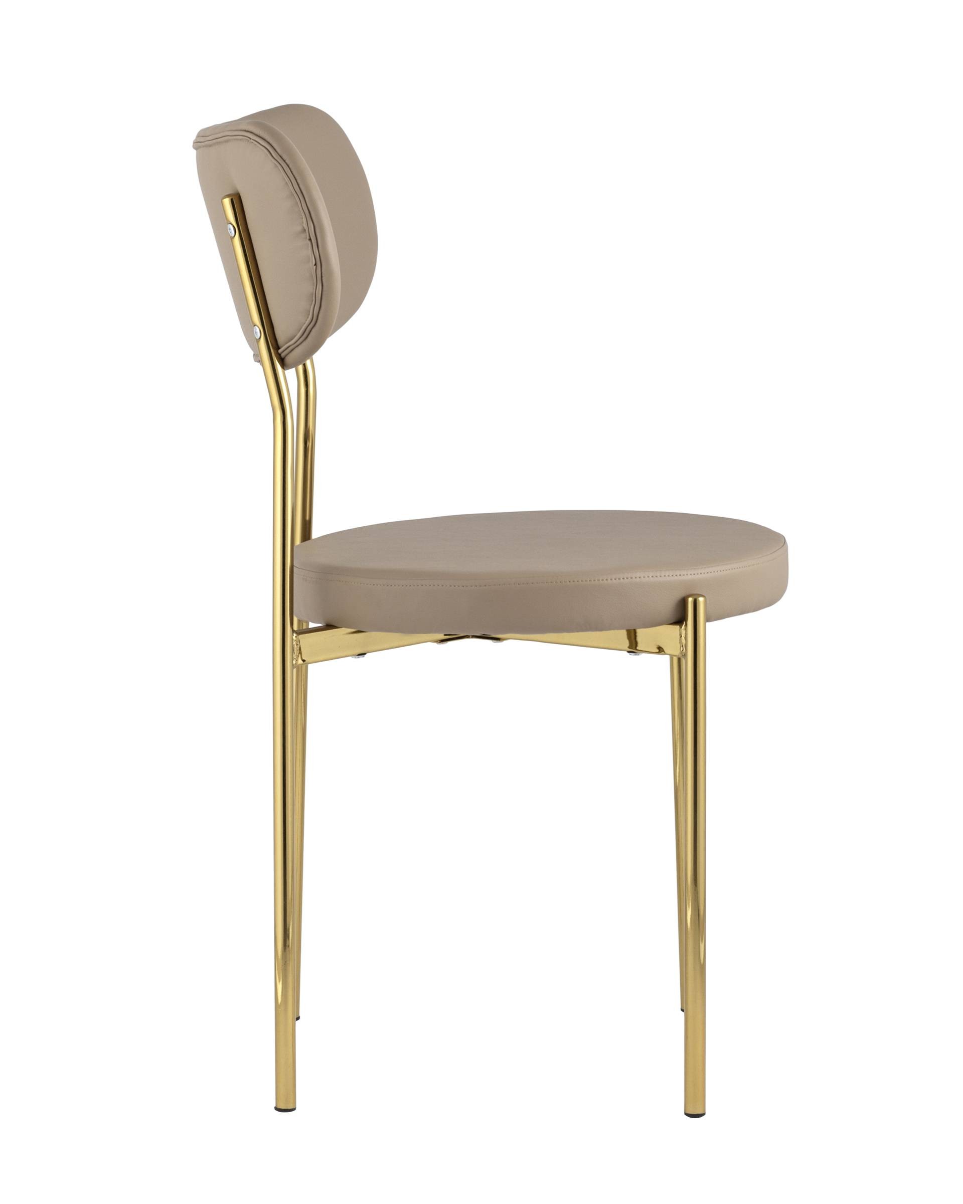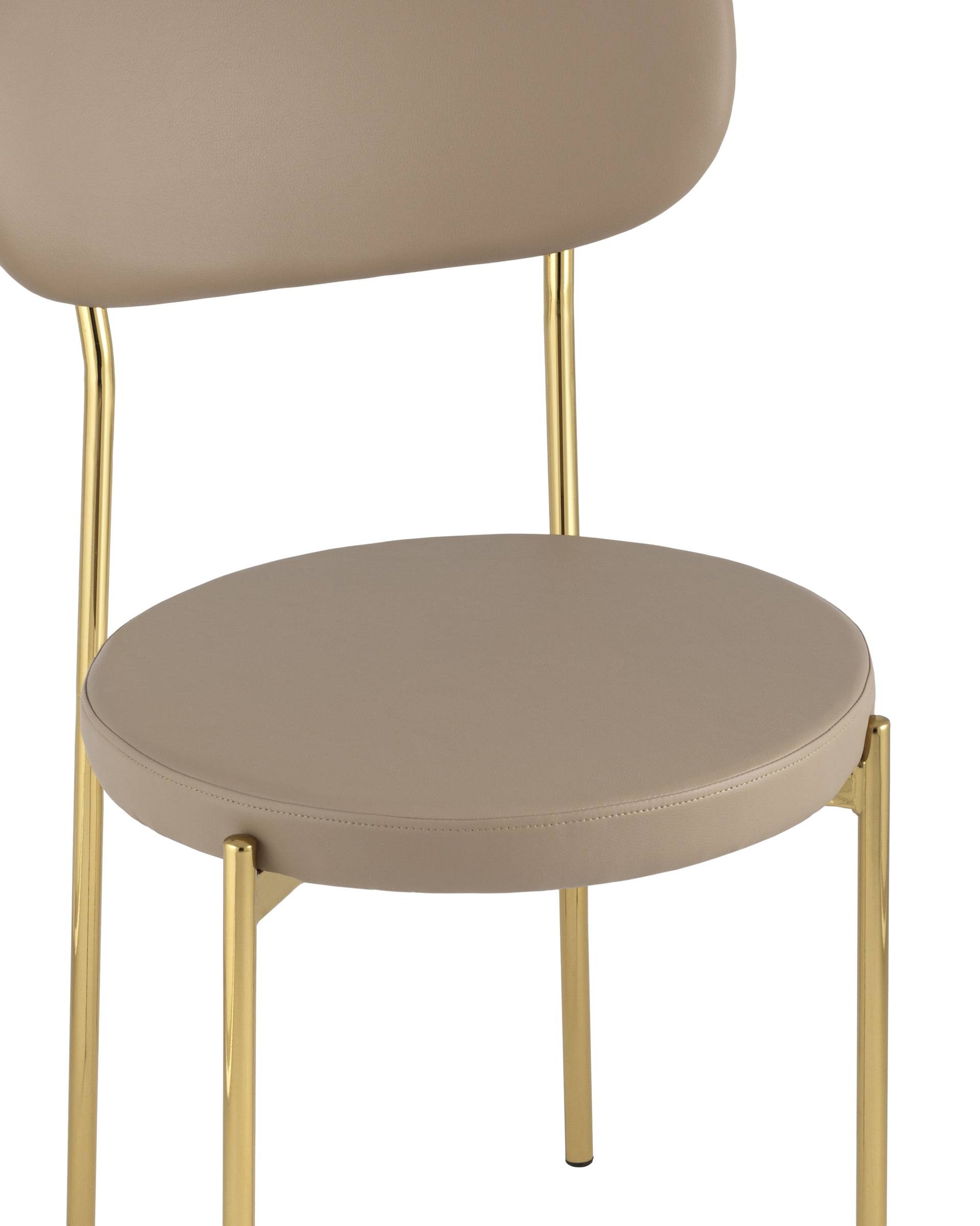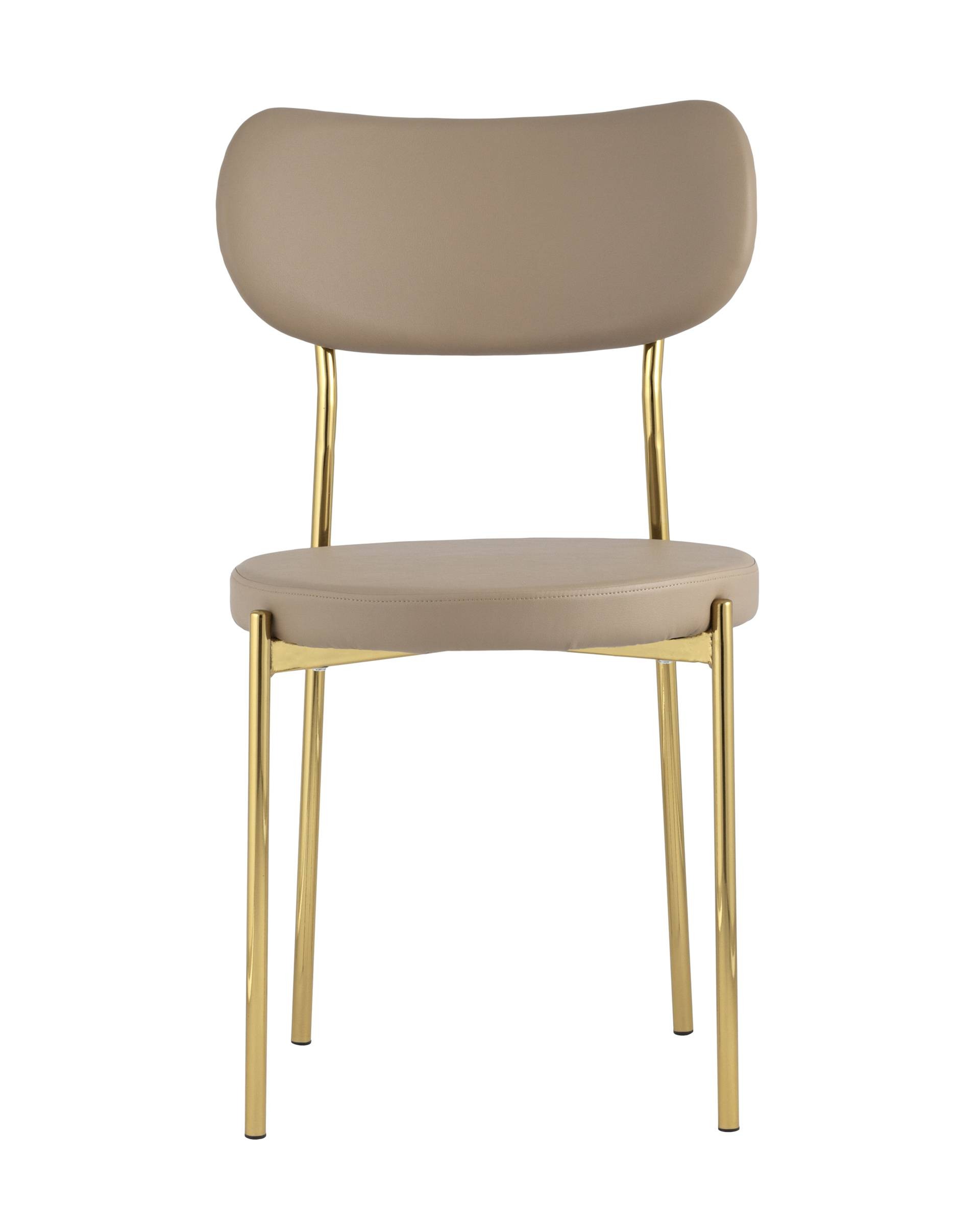 Обивка выполнена из прочной износостойкой экокожи, ножки изготовлены из металлас с покрытием в золотом оттенке. На ножках дополнительно предусмотрены специальные подпятники, которые предотвращают скольжение и повреждение напольного покрытия.