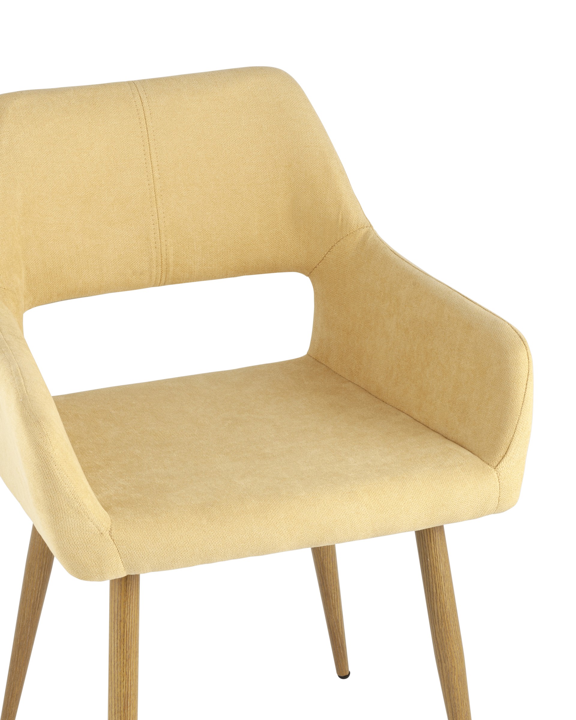 Стильный и мягкий кухонный стул имеет широкую эргономичную спинку и удобные подлокотники. Обивкой послужила высококачественная плотная ткань. Ножки металлические с принтом под дерево.