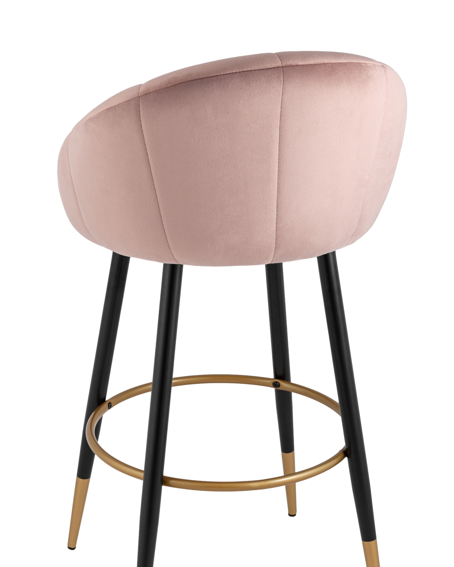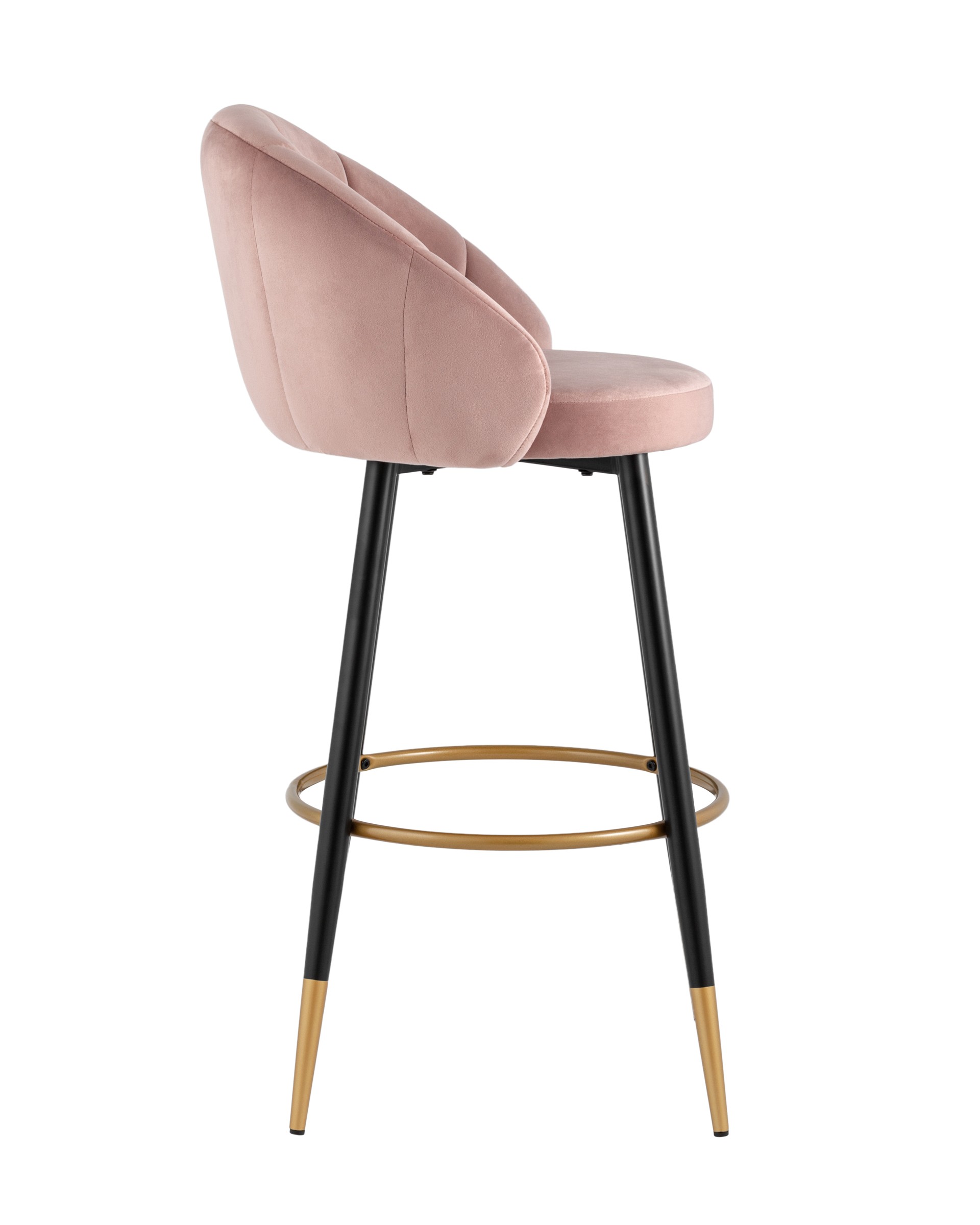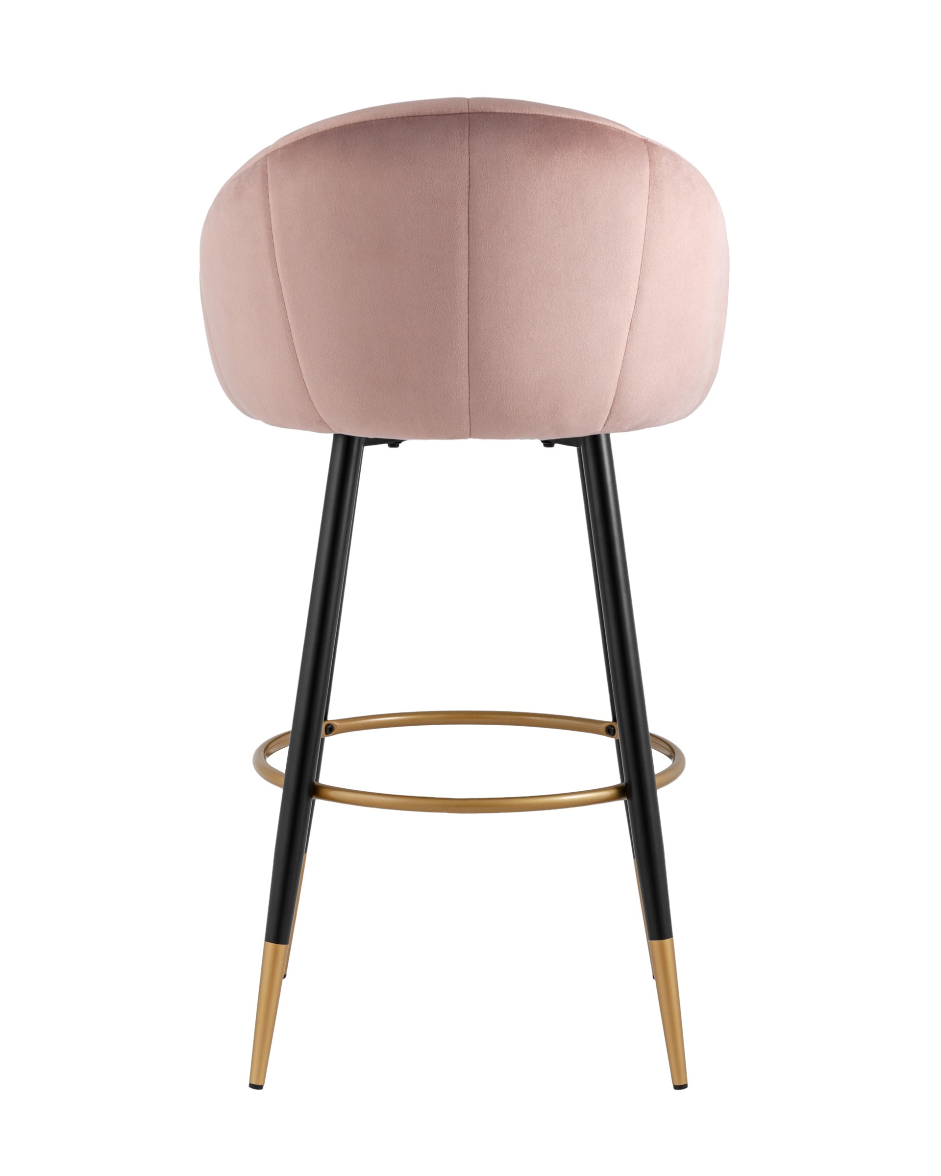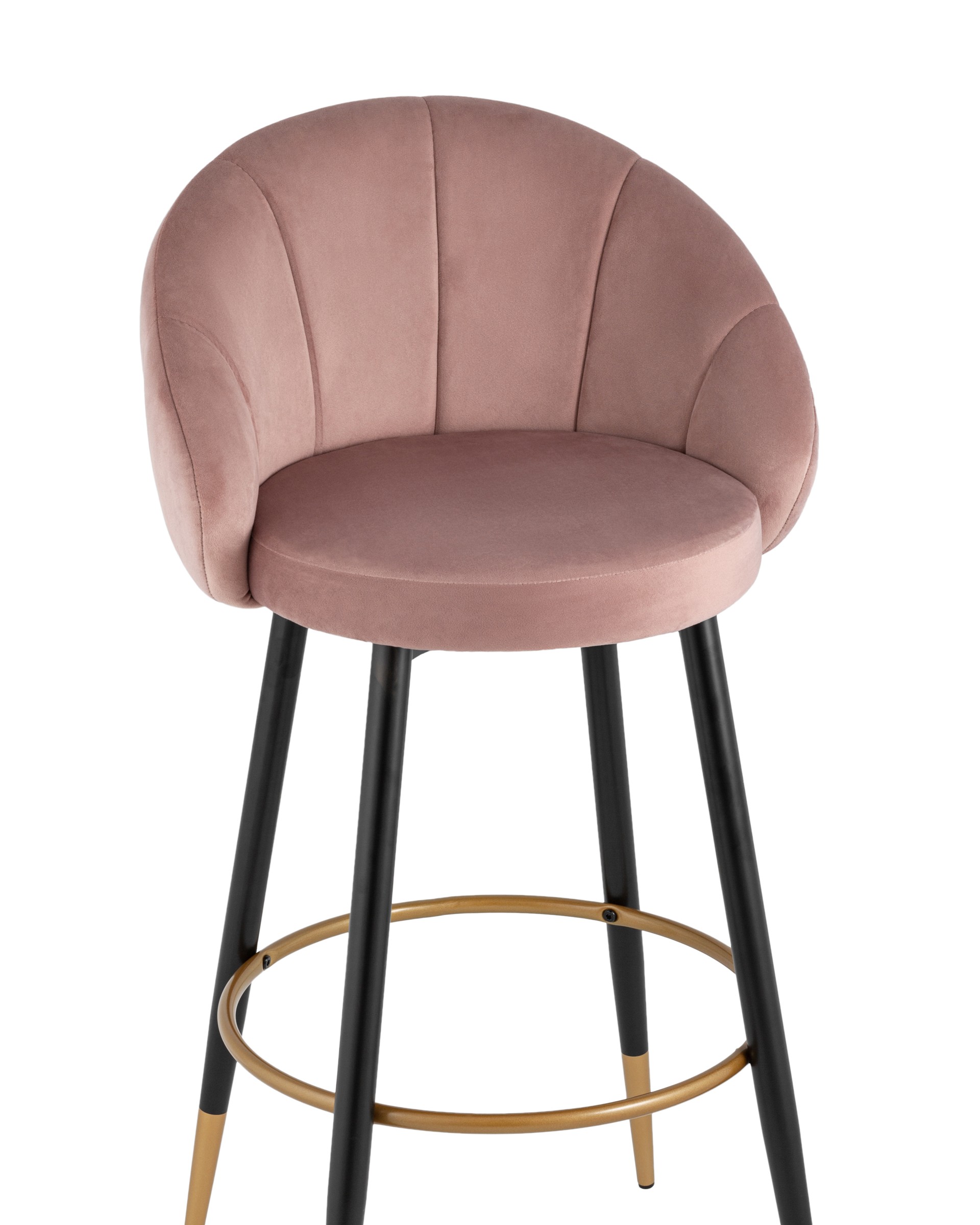 Яркий барный стул с необычной спинкой в обивке из прочного велюра. Надежная опора достигается благодаря металлическому каркасу и удобным устойчивым ножкам с золотым декором. Спинка с оригинальным дизайном украшена широкими полосами в виде веера. На ножках, для дополнительного комфорта при посадке, предусмотрена округлая подножка.
