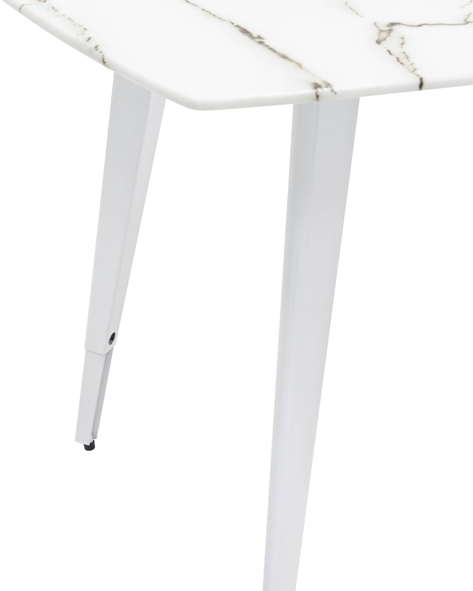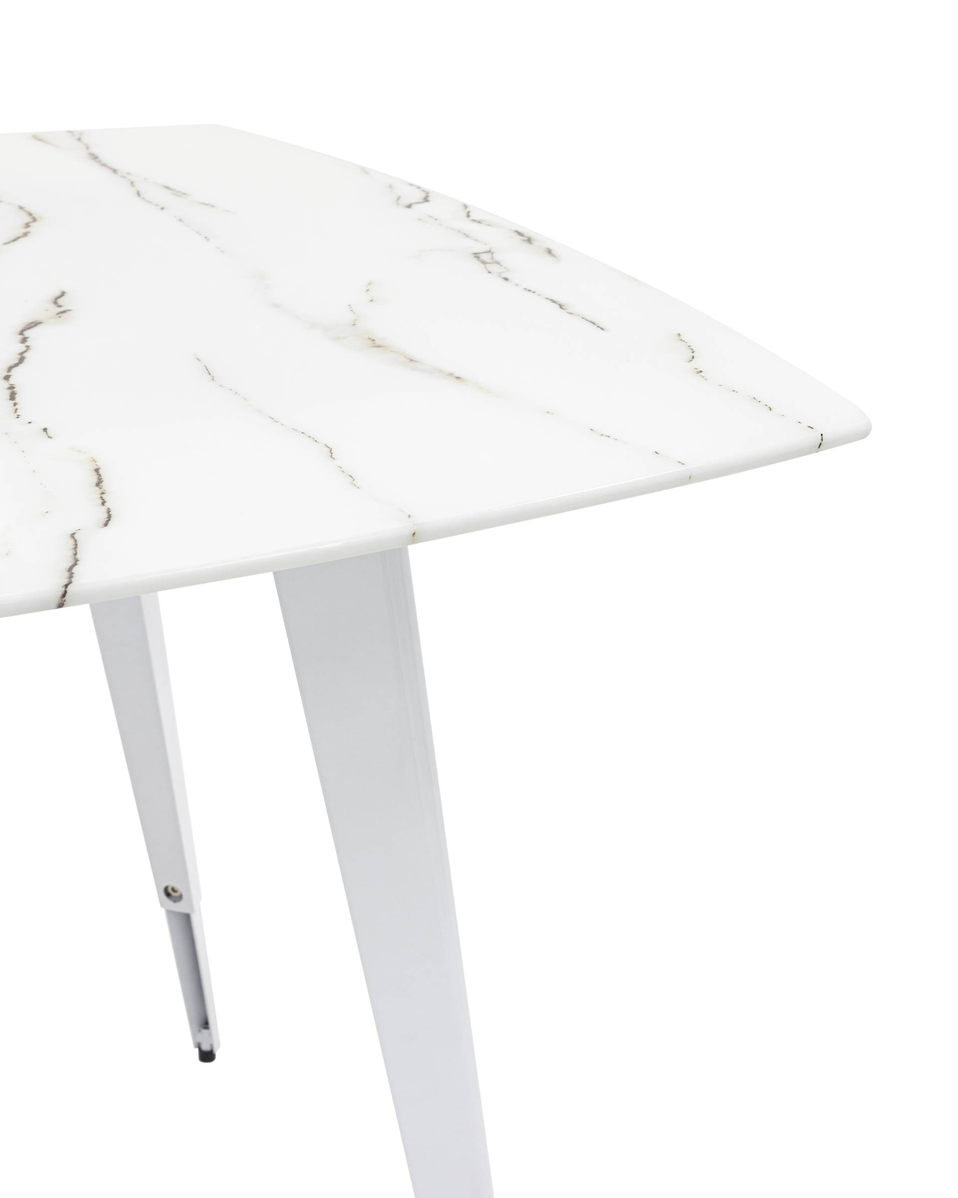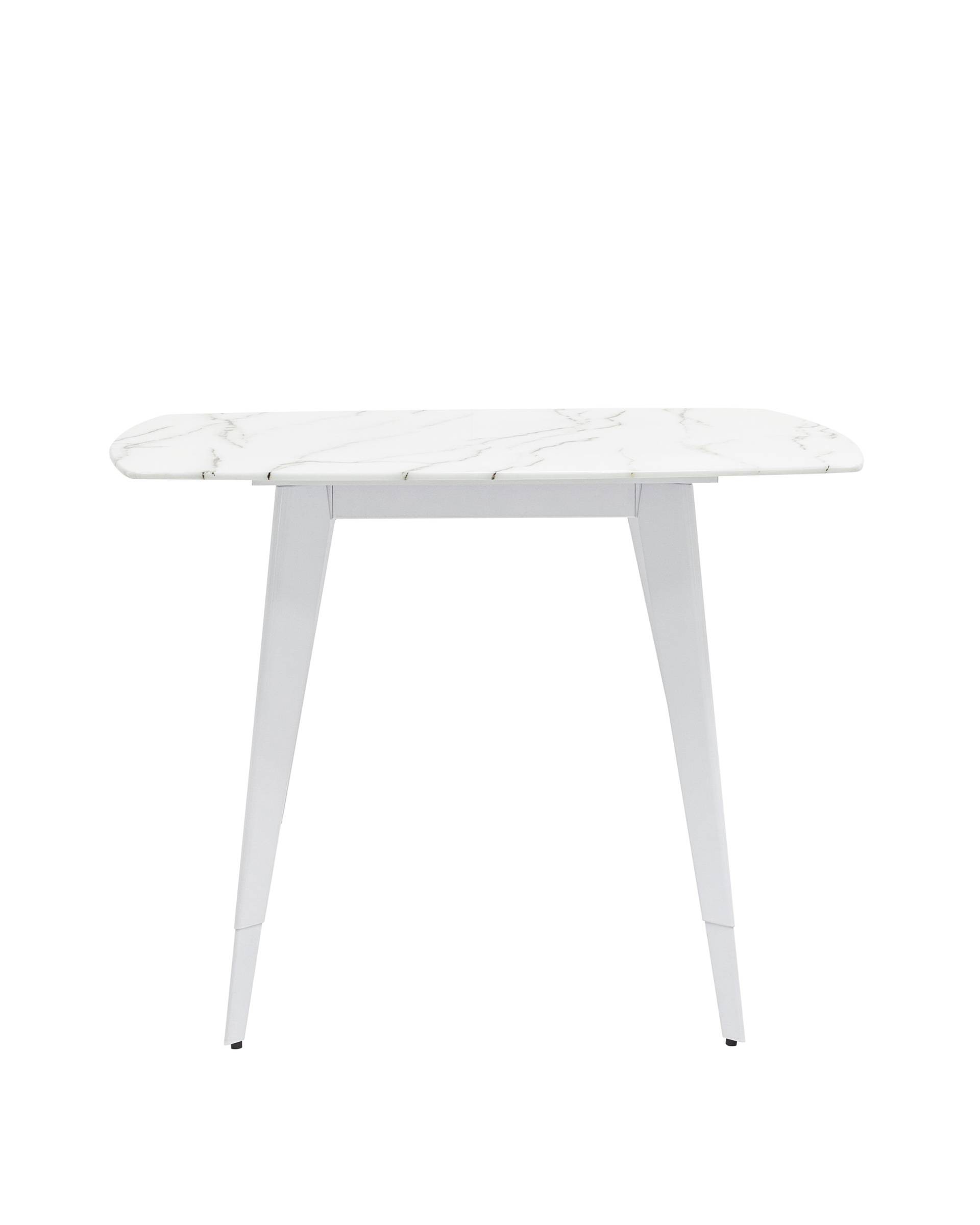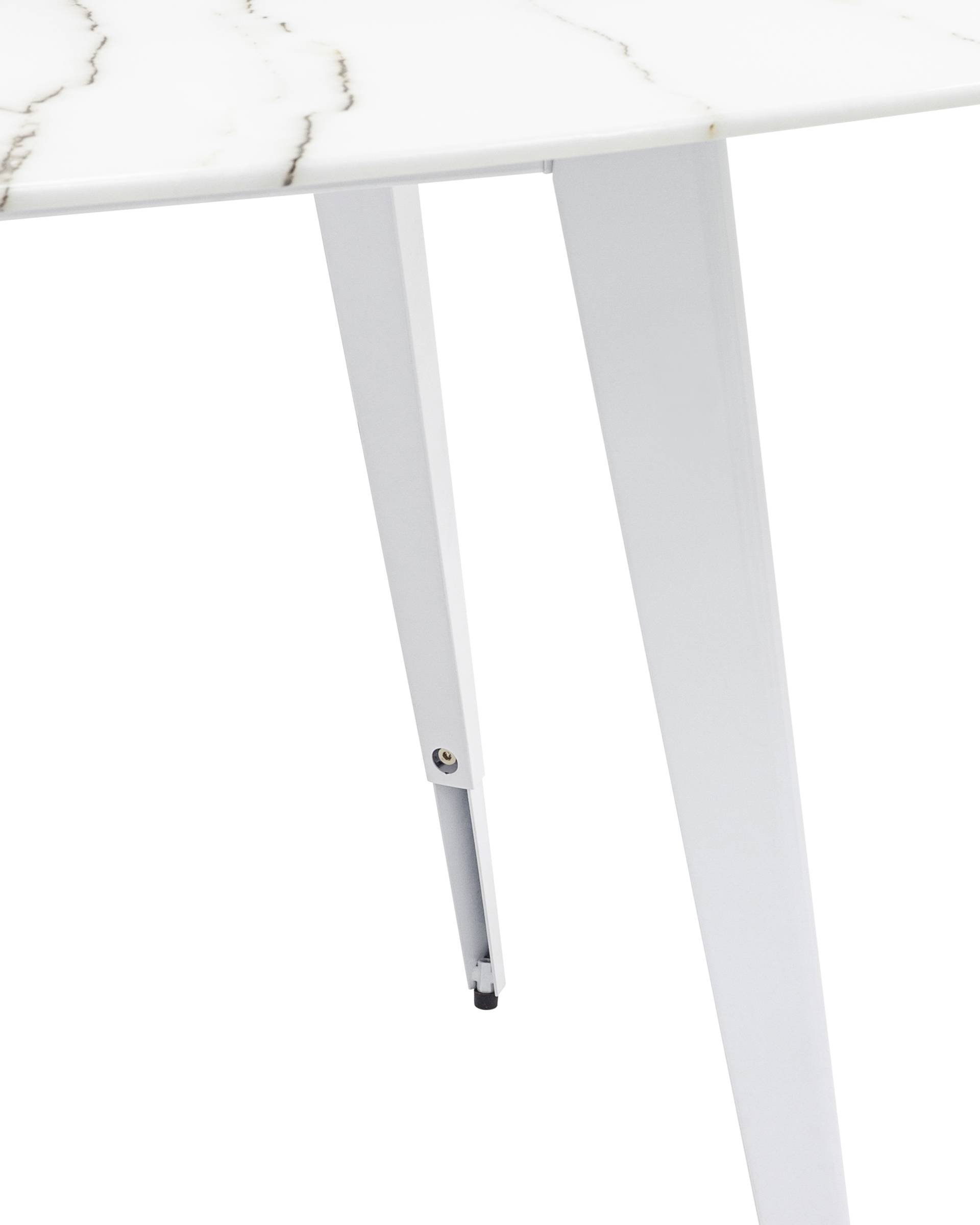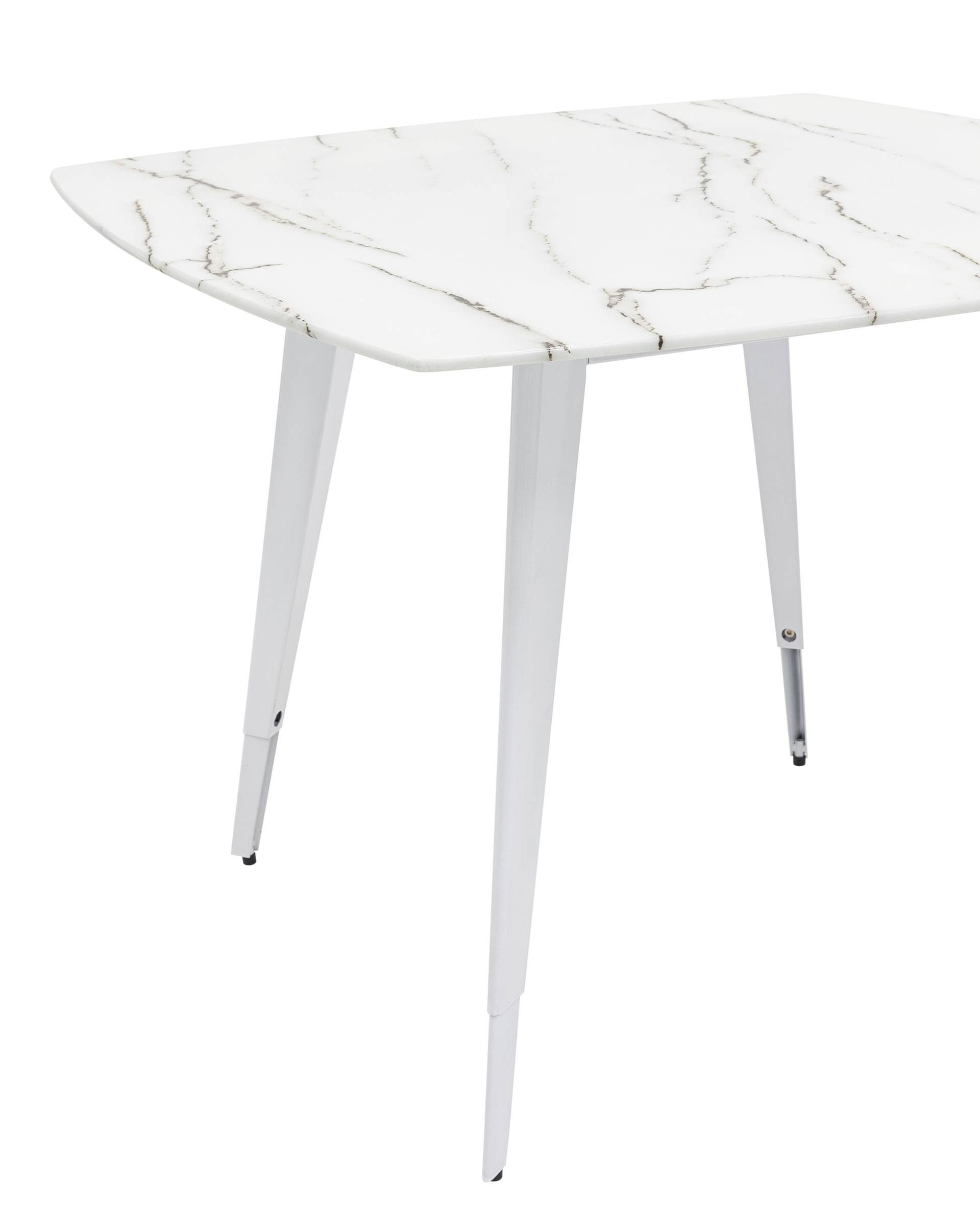 Обеденный стол с красивой стеклянной столешницей белого цвета с рисунком под мрамор.