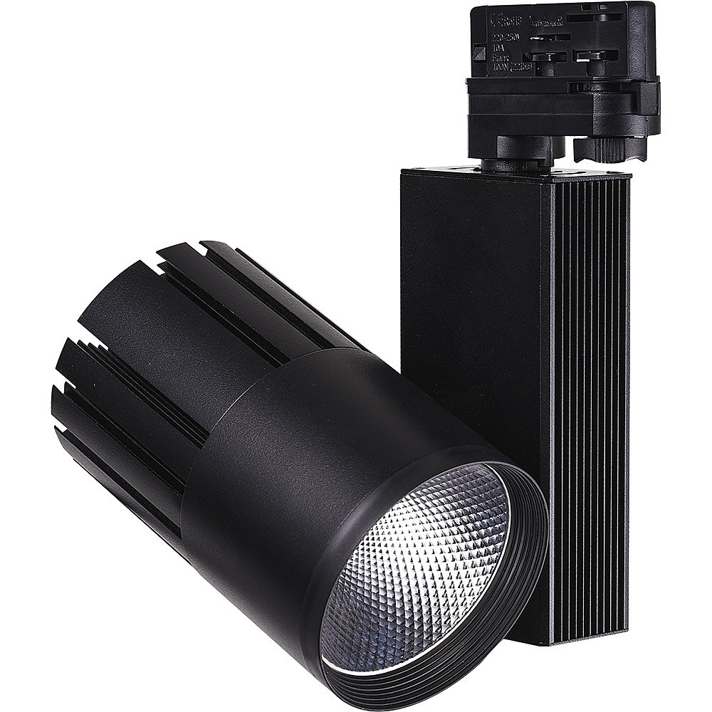 Светильник трековый на шинопровод, трехфазный (ДПО) FERON AL105, 40W, 4000К (белый), 170-265V, 3600Lm, угол освещения 35?, цвет черный, корпус алюминий, рассеиватель поликарбонат, вращение ?360?/?270?, 100*148*220 мм