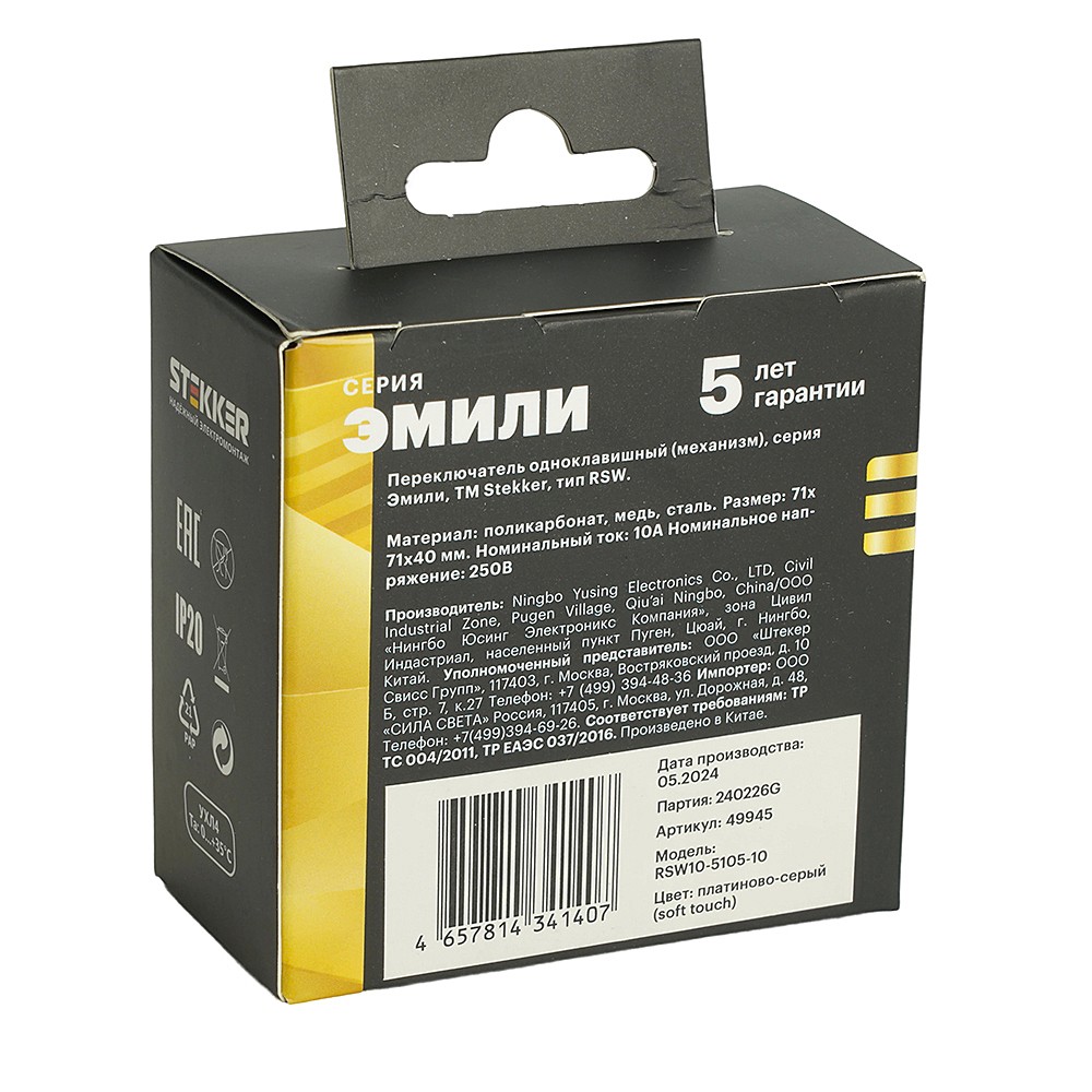 Переключатель 1-клавишный (механизм) Stekker Эмили 49945
